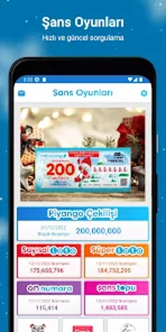 Şans Oyunları เป็นแอปพลิเคชันที่เกี่ยวข้องกับไลฟ์สไตล์สำหรับ Android ที่ช่วยให้ผู้ใช้สามารถตรวจสอบผลลัพธ์ของเกมลอตเตอรี่ต่างๆ เช่น Milli Piyango, Sayısal Loto, Şans Topu, On Numara, Süper Loto, และ Süper Piyango ได้อย่างง่ายดาย